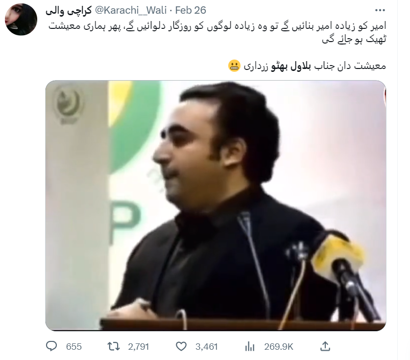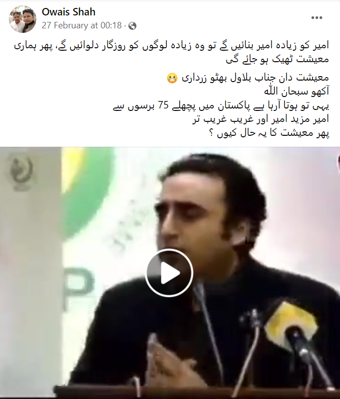 ایک فیس بُک صارفِ نے اس بلاول بھٹو کی ویڈیو کو شیئر کیا اور کیپشن میں لکھا: “امیر کو زیادہ امیر بنائیں گے تو وہ زیادہ لوگوں کو روزگار دلوائیں گے، پھر ہماری معیشت ٹھیک ہو جائے گی۔ معیشت دان جناب بلاول بھٹو زرداری آکھو سبحان اللّٰه۔ یہی تو ہوتا آرہا ہے پاکستان میں پچھلے 75 برسوں سے امیر مزید امیر اور غریب غریب تر پھر معیشت کا یہ حال کیوں؟”۔