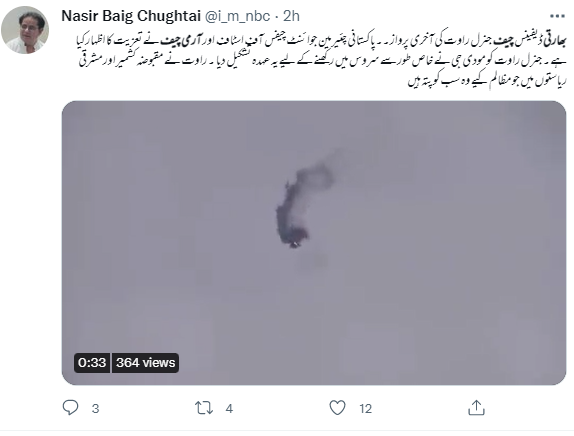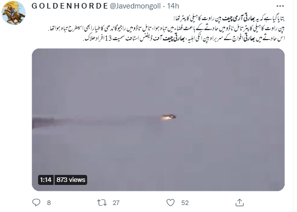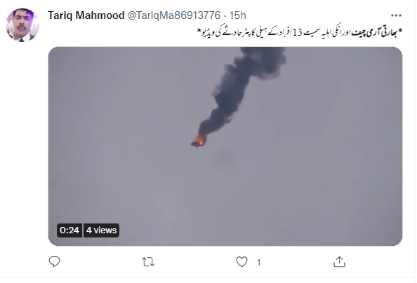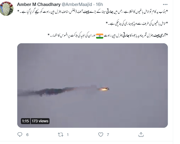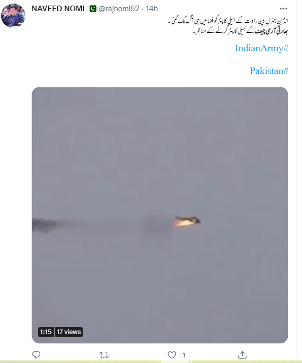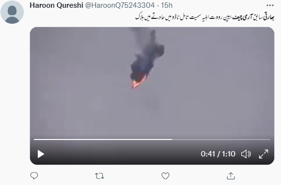 مذکورہ ویڈیو کو انڈین ایئرفورس کے ہیلی کاپٹر ایم آئی17وی5 کے کریش کا بتاکر ٹویٹر پر بھی شیئر کیا جا رہا ہے۔