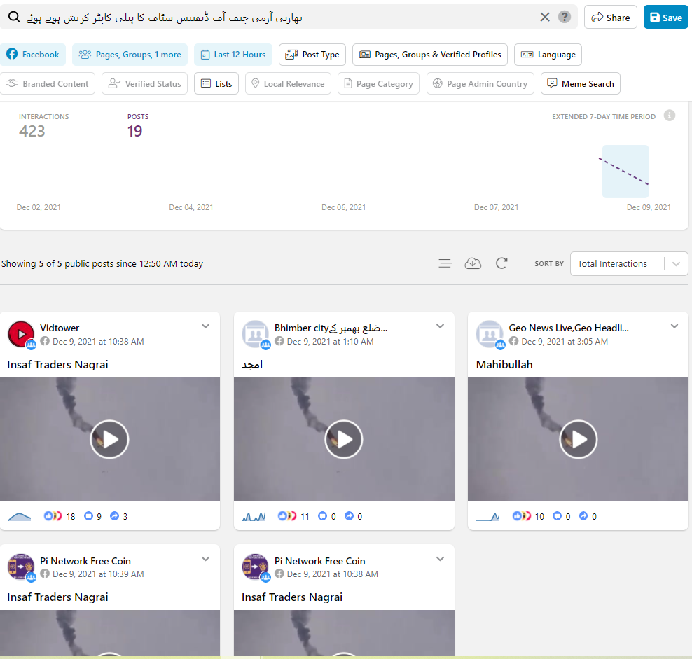فیس بک پر مذکورہ دعوے کے ساتھ شیئر کی گئی تصویر کو کتنے صارفین نے پوسٹ کیا ہے، یہ جاننے کے لئے ہم نے کراؤڈ ٹینگل پر کیورڈ سرچ کیا تو ہمیں پتا چلا کہ اس موضوع پر24 گھنٹوں میں 19 پوسٹ شیئر کئے گئے ہیں اور 423 فیس بک صارفین نے اس موضوع پر تبادلہ خیال کیا ہے۔