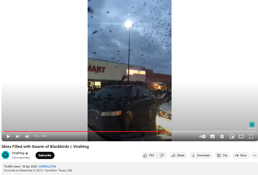 اسرائیل پر پرندوں کے حملے کا بتاکر شیئر کی گئی ویڈیو کے ایک فریم کو ہم نے گوگل ین ڈیکس سرچ کیا۔ جہاں ہمیں وائرل ہوگ نامی یوٹیوب چینل پر 18 اپریل 2020 کو اپلوڈ شدہ ہوبہو ویڈیو ملی۔ جس کے مطابق یہ ویڈیو ٹیکساس میں موجود ایچ مارٹ کے پارکنگ میں 16 دسمبر 2016 کو سیکڑوں کی تعداد میں جمع ہوئے کالے پرندوں کی ہے۔ اس حوالے سے میڈیا رپورٹس یہاں اور یہاں پڑھیں۔