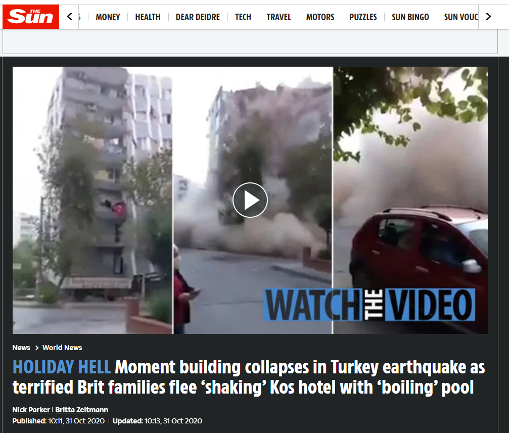 دی سن نامی نیوز سائٹ پر اس ویڈیو کو 31 اکتوبر 2020 کو ایک رپورٹ کے ساتھ شائع کیا گیا ہے۔ رپورٹ میں بتایا گیا ہے یہ ترکی کے کوس میں آنے والے زلزلے کی ویڈیو ہے، جس کی شدت کافی زہادہ تھی۔ زلزلے کی وجہ سات منزلہ عمارت منہدم ہوگئی۔