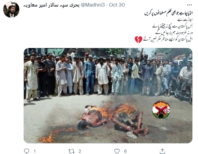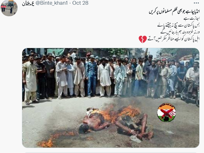حال کے دنوں میں الشيخ عبد الرازق المهدي نامی ٹویٹر صارف نے جلتے ہوئے انسانوں کی تصویر کو شیئر کیا ہے۔ انہوں نے عربی میں تصویر کے ساتھ لکھا ہے(ترجمہ) “گائے پرستوں کے ریوڑ مسلمانوں کے ہاتھ پاؤں میں بیڑیاں ڈال کر زندہ جلا دیتے ہیں” ساتھ ہیش ٹیگ میں کشمیری مسلمانوں کی جان بچانے کی اپیل بھی کی ہے۔ اس تصویر کو اردو کیپشن کے ساتھ بھی طنزیہ طور پر شیئر کیا گیا ہے۔