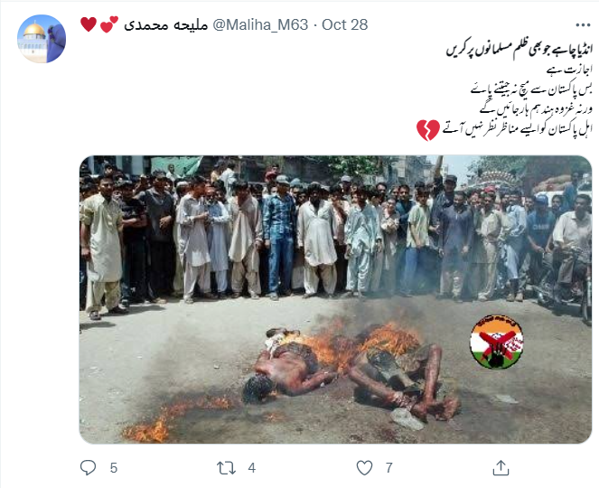 ٹویٹر پر ایک دل کو دہلا دینے والی تصویر شیئر کی جا رہی ہے۔ صارفین کا دعویٰ ہے “کشمیر میں مسلمانوں کو سرِعام زندہ جلائے جانے کی یہ تصویر ہے”۔ کچھ صارفین اس تصویر کو انڈیا پاکستان کے میچ سے جوڑ کر طنزیہ طور پر بھی شیئر کر رہے ہیں”۔ بتادوں کہ اس تصویر کو عربی ہیش ٹیگ الهند_تقتل_المسلمين،#أنقذوا_مسلمي_كشمير،#قاطعوا_المنتجات_الهندية،#نصرة_مسلمي_الهند_واجب_شرعي کے ساتھ شیئر کیا گیا ہے۔