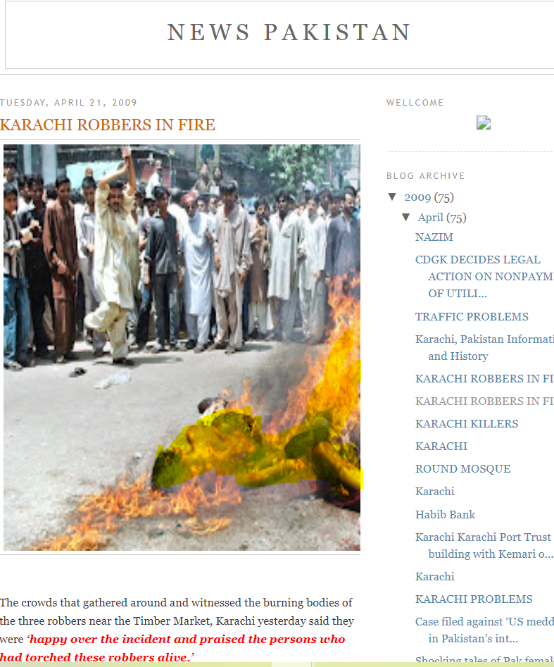 ہم نے جب ریورس امیج سرچ کے ساتھ کچھ کیورڈ سرچ کیا تو ہمیں نیوز پاکستان نامی بلاگس پر وائرل تصویر ملی، جسے 21 اپریل 2009 میں شائع کیا گیا تھا۔ بلاگس میں دی گئی جانکاری کے مطابق تصویر پاکستان کے کراچی کے ٹیمبر مارکیٹ کی ہے۔ جہاں لوگوں کی بھیڑ نے چوری کرنے کے الزام میں 3 ڈاکؤں کو سرعام زندہ جلا دیا تھا۔
