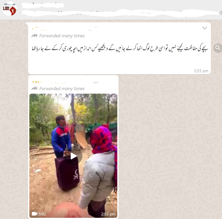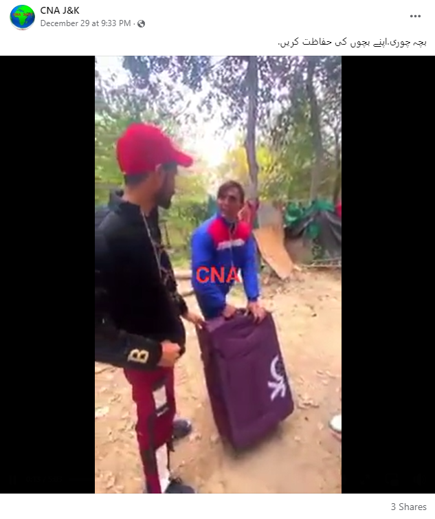سوشل میڈیا پر بچے کو ٹرالی بیگ میں اغوا کئے جانے کا ایک ویڈیو شیئر کیا جا رہا ہے۔ جس میں ایک شخص ٹرولی بیگ لے جاتا ہوا نظر آرہا ہے اور کچھ لوگ اس سے بحث و مباحثہ کرتے ہوئے نظر آ رہے ہیں۔ صارف نے ویڈیو کے کیپشن میں لکھا ہے کی “بچہ چوری کی اس واردات کو ضرور دیکھیں اپنے بچوں کی اور اپنی بھی حفاظت کو یقینی بنائیں”۔ اس ویڈیو کو واہٹس ایپ اور فیس بک دونوں پر صارفین شیئر کر رہے ہیں۔