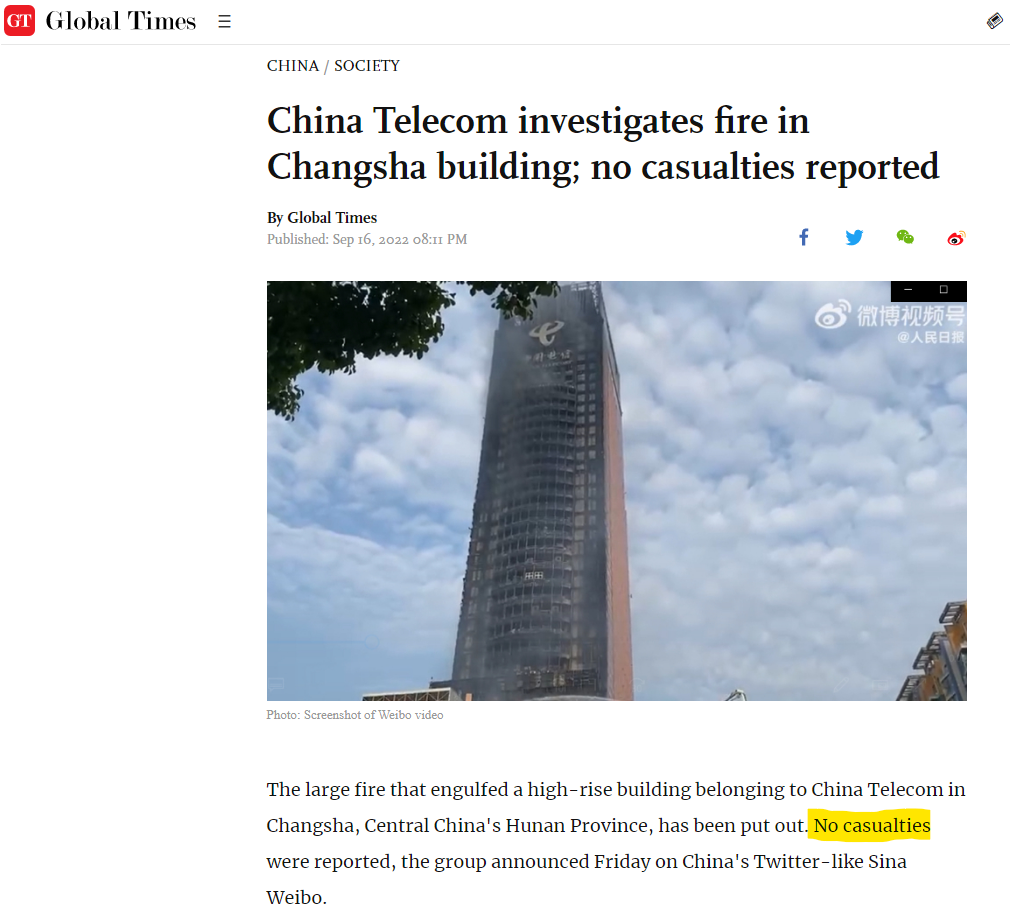 کیا چائنا ٹیلکام عمارت میں آگزنی کی وجہ سے 600 لوگوں کی موت ہوئی ہے؟ یہ جاننے کے لئے ہم نے کچھ کیورڈ سرچ کیا۔ سب سے پہلے ہم نے “اسکائی اسکریپر فائر ان چائنا ” کیورڈ سرچ کیا۔ جہاں ہمیں گلوبل ٹائمس اور سی جی ٹی این نامی چینی انگلش نیوز ویب سائٹس پر ویڈیو کے ساتھ شائع 16 ستمبر 2022 کی خبریں ملیں۔ ان خبروں کے مطابق چانگشا میں موجود چائنا ٹیلکام کی عمارت میں لگی آگ سے کوئی موت درج نہیں کی گئی ہے۔