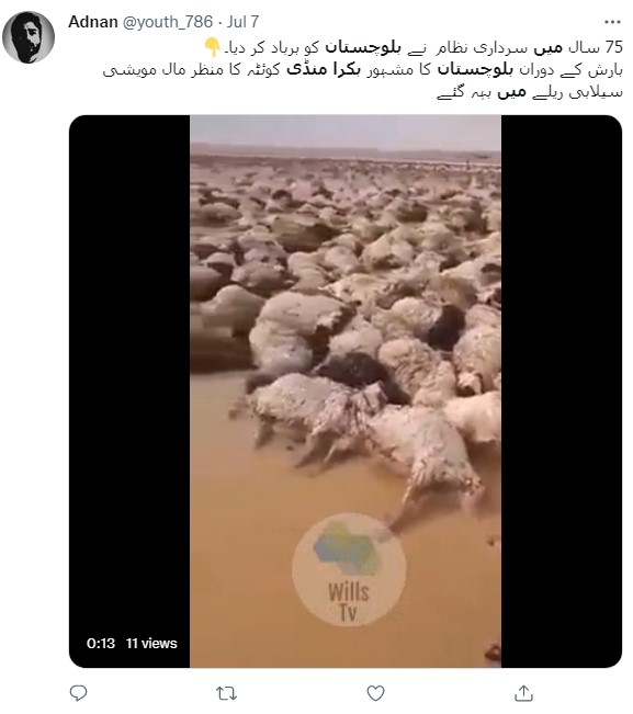 جنگ نیوز ویب سائٹ پر شائع 8 جولائی کی ایک رپورٹ کے مطابق بلوچستان میں تیز بارش اور سیلاب کے سبب 54 افراد کی موت ہو چکی ہے۔ اسی کے پیش نظر ایک ویڈیو کو بلوچستان کے بکرے منڈی کا بتاکر فیس بک، ٹویٹر اور یوٹیوب پر شیئر کیا جا رہا ہے۔ ویڈیو میں متعد مردہ بھیڑوں کو دیکھا جا سکتا ہے۔ بتا دوں یہ مہینہ عیدالاضحٰی کا ہے، جس میں صاحب ایمان اپنی حیثیت کے مطابق اللہ کے راہ میں جانوروں کی قربانی کرتے ہیں۔ ویڈیو سے متعلق صارفین کا دعوی ہے کہ یہ منظر بلوجستان کے بکرا منڈی میں بارش کے سبب مرے ہوئے جانور کا ہے۔