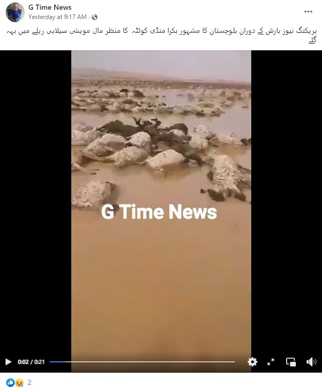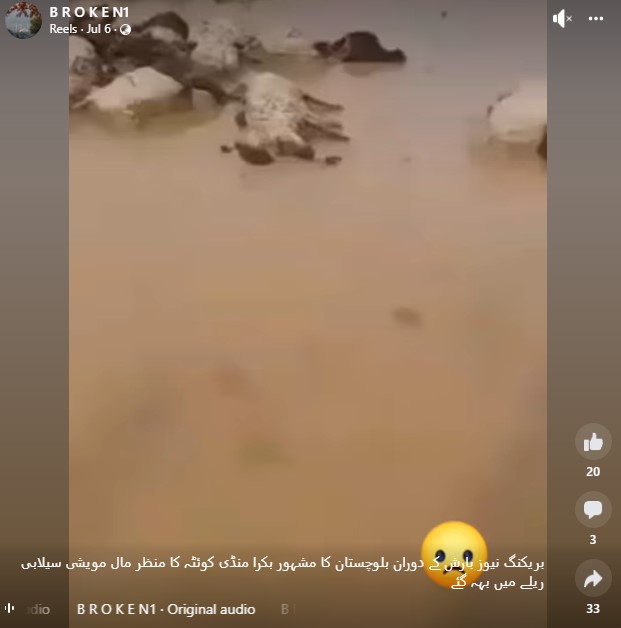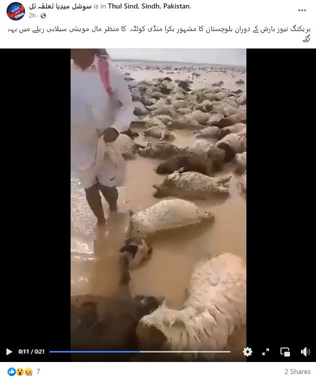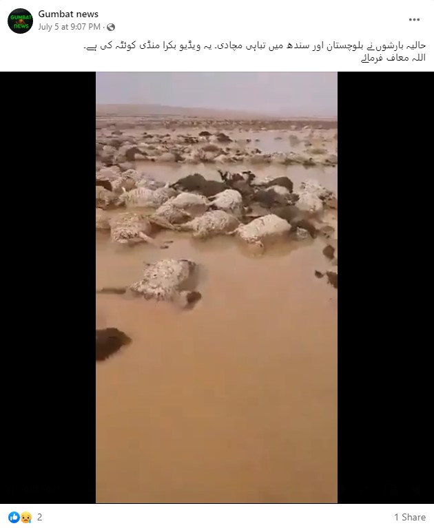 سوشل نٹورکنگ سائٹس پر مرے ہوئے جانوروں کی ایک ویڈیو کو بلوچستان کے بکرا منڈی کا بتاکر شیئر کیا جا رہا ہے۔ ویڈیو کے کیپشن میں ایک صارف نے لکھا ہے کہ “بلوچستان بکرا منڈی میں بارش کے بعد مرنے والے جانور”۔