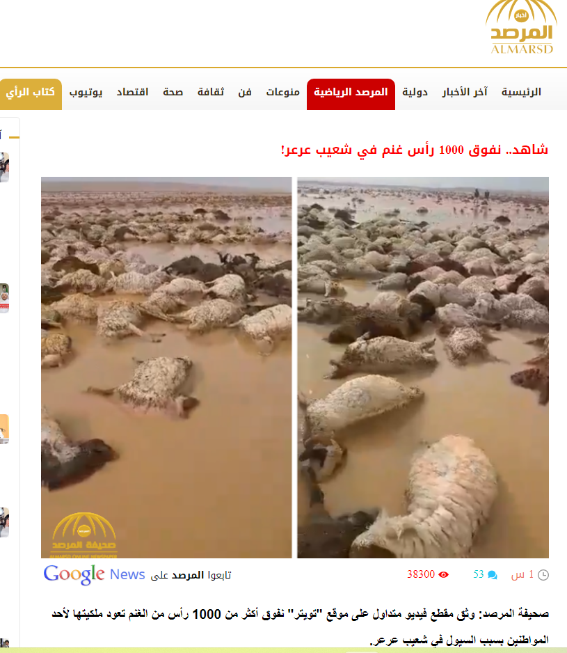 وائرل ویڈیو سے متعلق یوٹیوب پر دی گئی جانکاری سے متعلق ہم نے گوگل کیورڈ سرچ کیا۔ اس دوران سعودی عرب کی معروف نیوز ویب سائٹ المرصد پر شائع رپورٹ ملی۔ اس رپورٹ میں بھی وہی تصویر استعمال کی گئی ہے جسے سوشل میڈیا پر بلوچستان کے بکرا منڈی کا بتاکر شیئر کیا گیا ہے۔ المرصد نے بھی اپنی اس رپورٹ میں ویڈیو کے حوالے سے لکھا ہے کہ سعودی عرب کے شعیب عرعر میں تیز بارش کے سبب ایک ہزار بھیڑوں کی اموات ہوگئیں۔