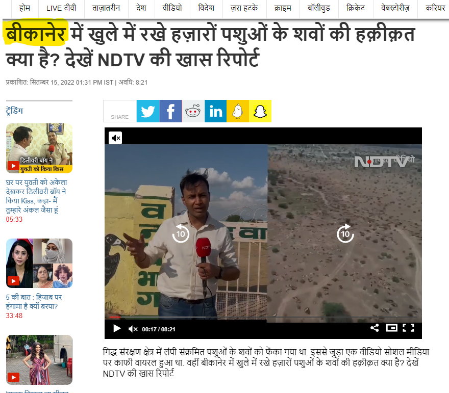 اس ویڈیو کی حقیقت جاننے کے لئے ہم نے سب سے پہلے ویڈیو کو کیفریم میں تقسیم کیا اور اس کا ریورس امیج سرچ کیا۔ اس دوران ہمیں نیوز 24 آن لائن اور بھاسکر ڈاٹ کام پر اس ویڈیو کے کیفریم کے ساتھ شائع خبریں ملیں۔ دونوں ہی خبروں میں اس تصویر کو بیکانیر کے ایک ڈمپنگ یارڈ کا بتایا گیا ہے۔ جہاں لمپی وائرس سے مری ہوئی ہزاروں گائیوں کو ڈمپ کیا گیا تھا۔ رپورٹ میں یہ بھی واضح کیا گیا ہے کہ اب تک ملک کی کئی ریاستوں کی 10 لاکھ سے زائد گائیوں کو لمپی وائرس اپنی چپیٹ میں لے چکا ہے۔
