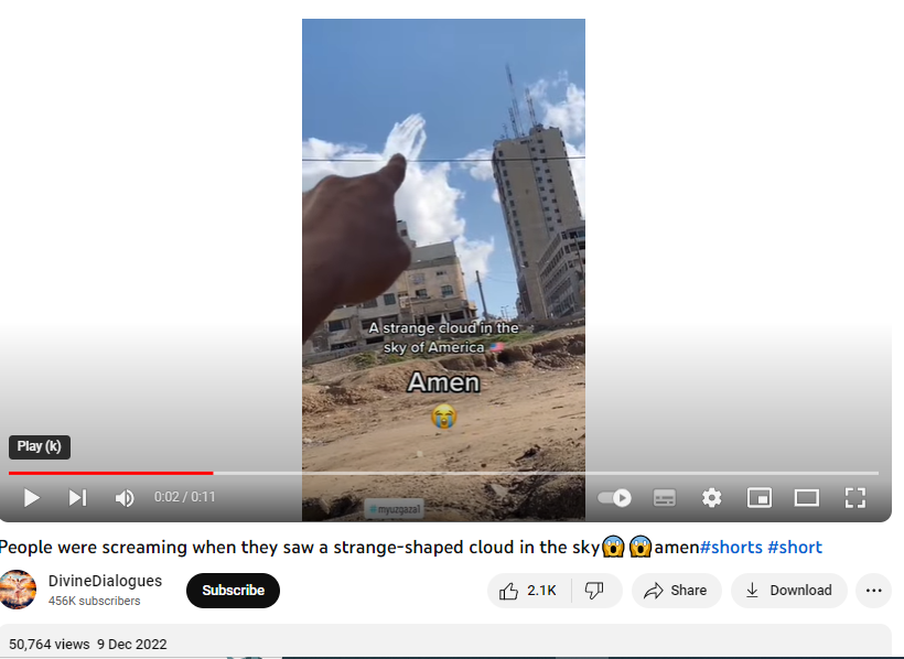 فیس بک پر ایک منٹ 8 سیکینڈ کی ایک ویڈیو کو فلسطین میں ہلاک ہو رہی عوام سے منسوب کرکے شیئر کیا جا رہا ہے، جس کی ابتدا میں کچھ لوگ آسمان کی طرف انگلیوں سے اشارہ کرتے ہوئے نظر آرہے ہیں، جس کے بعد آسمان میں بادل الگ الگ شکل میں نظر آرہے ہیں، جیسے جوڑے ہوئے ہاتھ، انسانی خاکے، پرندے اور مسجد کی مناروں کو دیکھا جا سکتا ہے۔ دعویٰ کیا جا رہا ہے کہ یہ فلسطین میں فرشتوں کی آمد کا منظر ہے۔