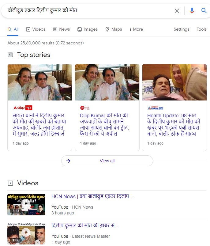 اداکار دلیپ کمار کی موت کے حوالے سے گوگل کیورڈ سرچ کیا۔ اس دوران ہمیں اسکرین پر وائرل دعوے سے متعلق کئی خبریں ملیں۔ جس میں دلیپ کمار کے انتقال کی خبر کو افواہ بتایا گیا ہے۔