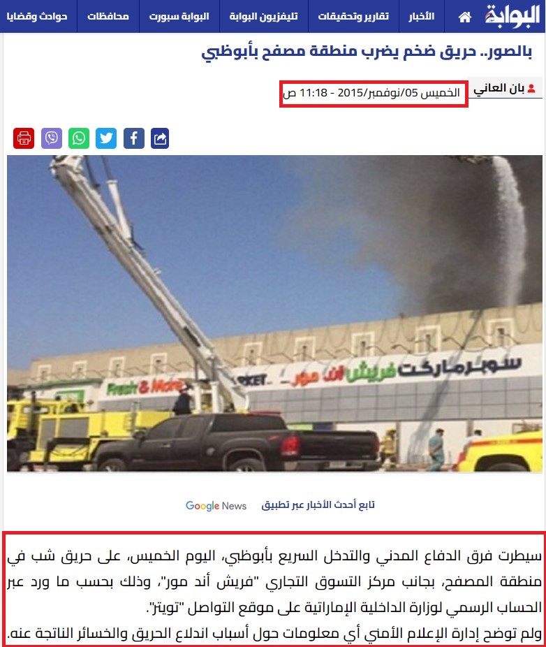 جب ہم نے مذکورہ عربی کیورڈ کو گوگل پر سرچ کیا تو ہمیں 24اے ای اور البوابۃ نامی عربی نیوز ویب سائٹ پر وائرل ویڈیو سے متعلق 5 نومبر 2015 کی خبریں ملیں۔ جس کا ترجمہ ہے “ابوظبی کے مصفح میں موجود سوپرمارکت فريش أند مور نامی کمرشیل شاپنگ مال میں لگی آگ لگنے کی وجہ سے مالی نقصان ہوا تھا”۔ اب ان رپورٹس سے پتا چلا کہ ویڈیو تقریباً 7 سال پرانی ہے اور حالیہ ڈرون حملے کی نہیں ہے۔