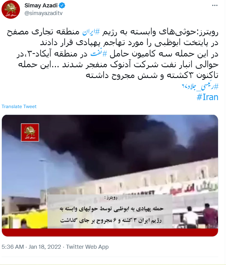 سوشل میڈیا پر ایک عمارت میں لگی آگ کی پندرہ سیکینڈ کے ویڈیو کو ابوظبی ڈرون حملے کا بتاکر شیئر کیا گیا ہے۔ ویڈیو کے کیپشن میں لکھا ہے کہ ابوظبی میں ڈرون حملے میں دو بھارتی شہری اور ایک پاکستانی شہری ہلاک ہوگئے، اس حملے کی ذمہ داری یمن کے حوثی باغیوں نے قبول کر لی ہے۔