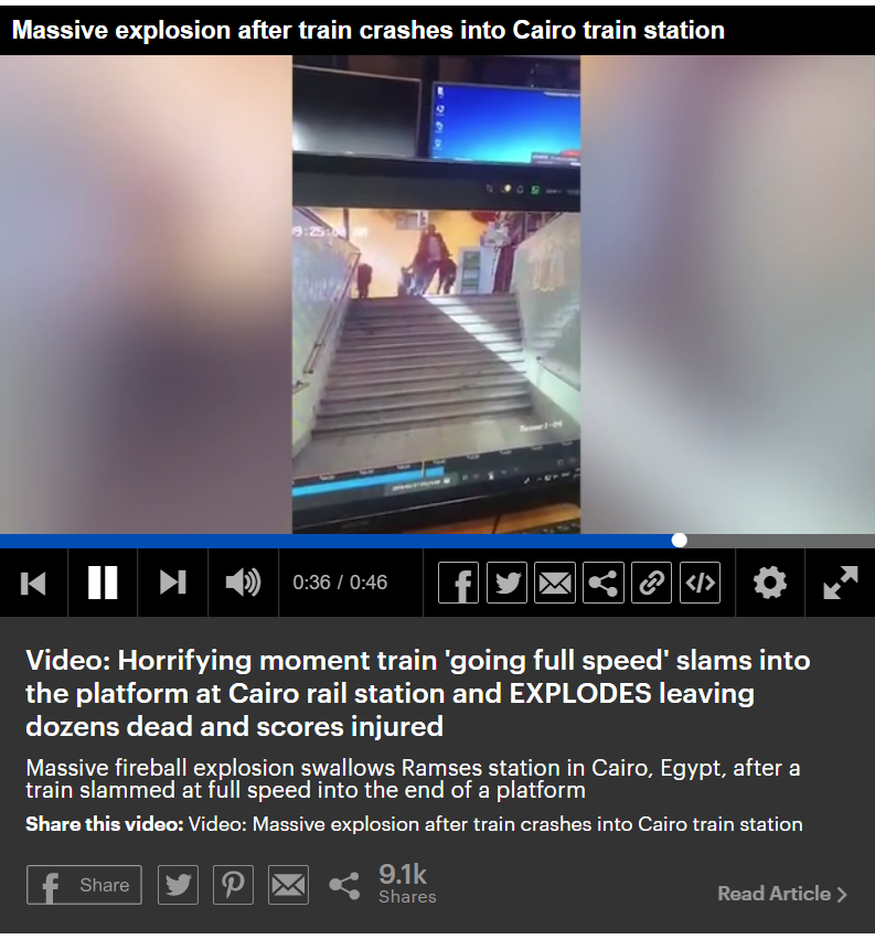 پورٹل میں وہی ویڈیو موجود ہے، جسے وائرل ویڈیو کے آخری حصے میں دیکھا جا سکتا ہے۔ فروری 2019 کی اس رپورٹ کا عنوان ہے “ویڈیو : بھیانک لمحہ جب پوری رفتار سے چلتی ہوئی ٹرین قاہرہ ریلوے اسٹیشن پر پلیٹ فارم سے ٹکرائی اور اس حادثے میں درجنوں افراد کی اموات ہوگئی اور متعدد زخمی ہو گئے”۔
