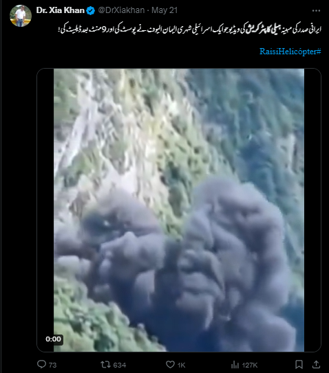 فیس بک اور ایکس پر ہیلی کاپٹر کریش کی ایک ویڈیو شیئر کی جا رہی ہے۔ جس میں ایک ہیلی کاپٹر کو فضاء سے پہاڑوں کے درمیان گرتا ہوا دیکھا جا سکتا ہے اور اس میں دھماکے کے بعد تیز شعلے اور دھواں نکلتا ہوا نظر آرہا ہے۔ صارفین کا دعویٰ ہے کہ یہ منظر ایرانی صدر ابراہیم رئیسی کے ہیلی کاپٹر حادثے کی ہے۔