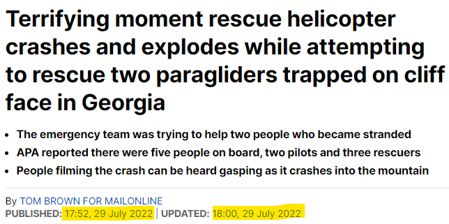 ہم نے وائرل ویڈیو کو انوڈ ٹول کی مدد سے کیفریم میں تقسیم کیا اور ان میں سے چند فریم کو ہم نے گوگل لینس پر تلاشا۔ جہاں ہمیں 29 جولائی 2022 کو شائع شدہ میل آن لائن کی ایک رپورٹ میں ہوبہو ویڈیو موصول ہوئی۔ جس میں ہیلی کاپٹر کریش کی اس ویڈیو کو جارجیا کے گوڈاؤری میں پہاڑ کی چوٹی پر پھنسے دو پیرا گلائیڈرس کو رسکیو کرنے گئے ہیلی کاپٹر کے کریش ہونے کا بتایا گیا ہے۔ اس کے علاوہ یہی ویڈیو ہمیں نیوز فلور پر بھی ملی۔ جس میں بھی اسے جارجیا کا بتایا گیا ہے۔