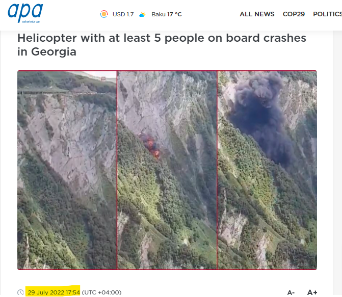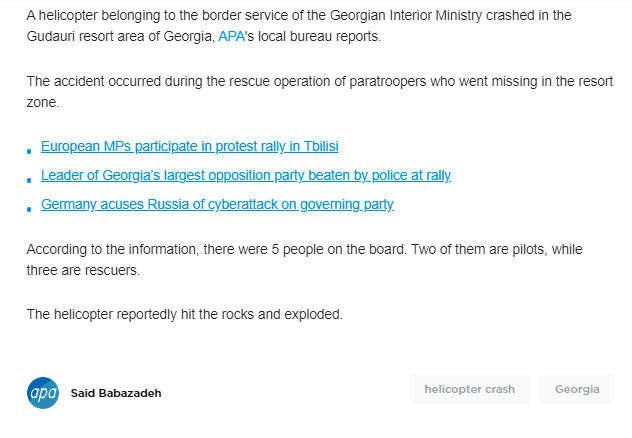 اس کے علاوہ ہمیں 29 جولائی 2022 کو آذربائیجان سے شائع ہونے والی نیوز ویب سائٹ اے پی اے پر مذکورہ وائرل ویڈیو کے کیفریم کے ساتھ شائع ایک آرٹیکل موصول ہوا۔ جس کے مطابق ہیلی کاپٹر جارجیا کی وزارت داخلہ کی سرحدی سروس کی تھی۔ جس میں کُل 5 افراد موجود تھے، جن میں دو پائیلٹ اور تین بچاؤ کرنے والے ملازمین۔ یہ حادثہ اس وقت پیش آیا جب گوڈاؤری ریزارٹ کے علاقے میں دو لاپتہ پیرا گلائیڈر کی تلاش کے لئے سرچ آپریشن چلایا جا رہا تھا۔ جہاں یہ ہیلی کاپٹر پہاڑ کی چوٹی سے ٹکرا گیا تھا۔