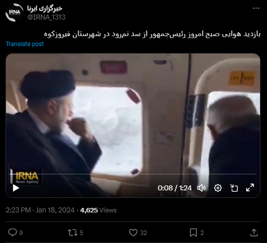 ایرانی صدر ابراہیم رئیسی کے آخری سفر کا بتاکر شیئر کی گئی ویڈیو کے ایک فریم کو “ایرنا” کیورڈ کے ساتھ گوگل ریورس امیج سرچ کیا۔ جہاں ہمیں 18 جنوری 2024 کو شیئر شدہ ہوبہو ویڈیو خبرگزاری ایرنا نامی ایکس ہینڈل پر ملی۔ جس کے ساتھ دی گئی معلومات کے مطابق ایرانی صدر کی یہ ویڈیو فیروزکوہ شہر میں موجود نمرود ڈیم کے فضائی دورے کی ہے۔