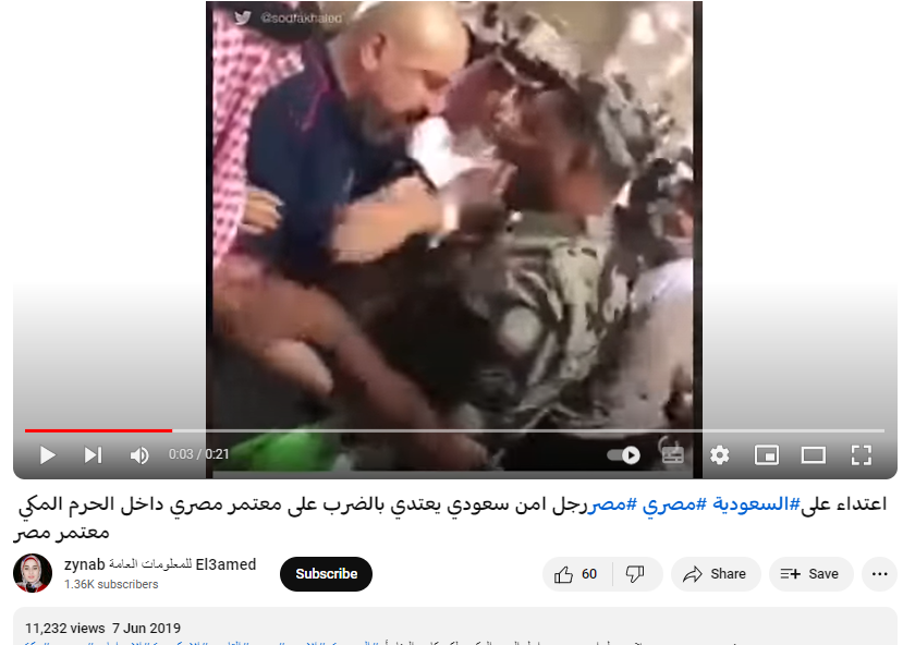 ہم نے وائرل ویڈیو کے ایک فریم کو گوگل ریورس امیج سرچ کیا۔ جہاں ہمیں ہوبہو ویڈیو 7 جون 2019 کو اپلوڈ شدہ زینب نامی یوٹیوب چینل پر ملی۔ جس میں اس ویڈیو کے حوالے سے لکھا ہے کہ ایک مصری حاجی کو مکہ مکرمہ میں سعودی عرب کی سیکورٹی نے مارا پیٹا تھا۔