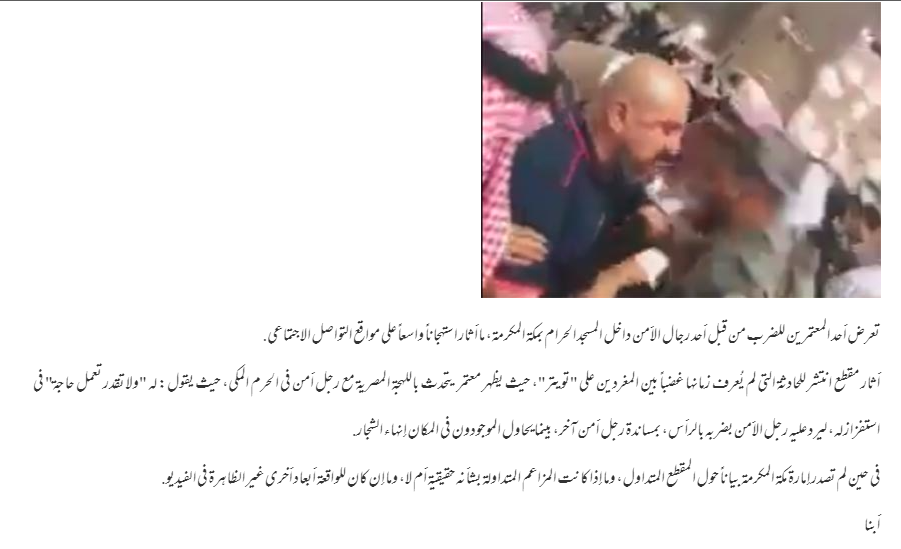 مذکورہ ویڈیو سے یہ واضح ہوا کہ اہل فلسطین کے لئے دعا کر رہے مصری حاجی کی یہ ویڈیو پرانی ہے۔ وائرل ویڈیو کے حوالے سے ہمیں عربی نیوز ویب سائٹس الشرق، السبطین اور القدس عربی پر جون 2019 کی خبریں موصول ہوئیں۔ جس میں بھی یہی لکھا ہے کہ مصری حاجی کو خانہ کعبہ میں سیکورٹی نے ماراپیٹا تھا۔ جس کے بعد ویڈیو وائرل ہوئی، لیکن حکومت یا انتظامیہ کی جانب سے کوئی وجوہات پیش نہیں کی گئی تھیں۔