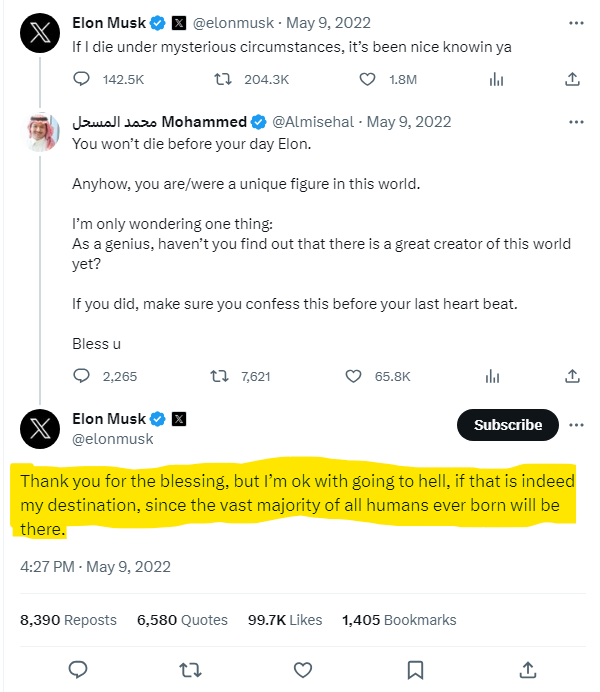 ایلون مسک کی جس تصویر کو شیئر کرکے اسلام قبول کرنے کا دعویٰ کیا جا رہا ہے۔ اسے جب ہم نے ریورس امیج سرچ کیا تو معلوم ہوا کہ اس تصویر کو ایلون مسک نامی پیروڈی اکاؤنٹ سے مزاحیہ کیپشن کے ساتھ شیئر کیا گیا تھا۔