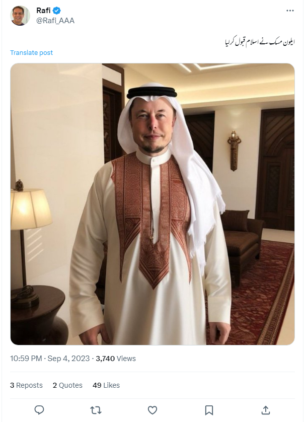 ٹویٹر پر ایک صارف نے ایلون مسک کی ایک تصویر شیئر کی ہے۔ جس میں وہ عربی لباس میں نظر آرہے ہیں۔ صارف کا دعویٰ ہے کہ ایلون مسک نے اسلام قبول کر لیا ہے۔