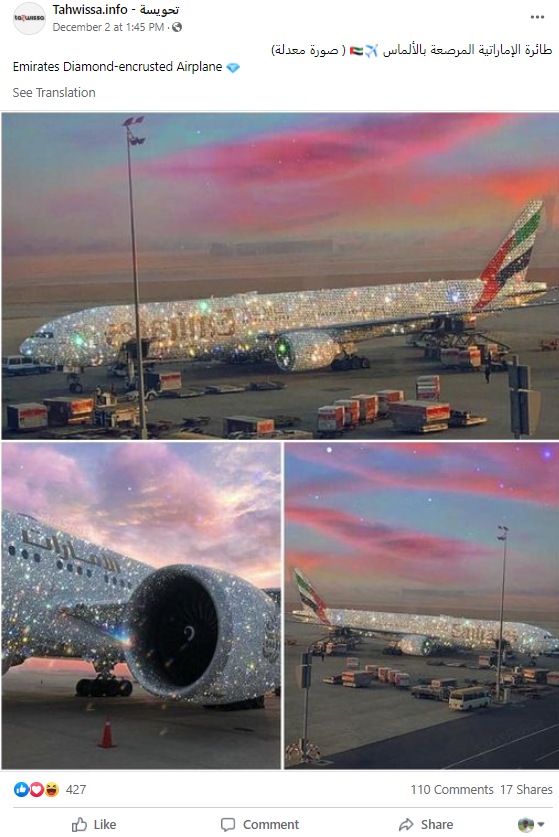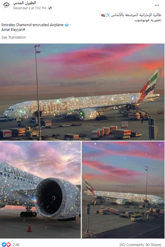 سوشل میڈیا پر نگینوں اور ہیروں سے سجے طیارے کا کولاج شیئر کیا جا رہا ہے۔ صارف کا دعویٰ ہے کہ امارات ایئر لائنز کے طیارے کو ہیروں سے سجا دیا گیا ہے۔ صارف نے تصویر کے کیپشن میں عربی اور انگلش زبان میں”طائرة الإماراتية المرصعة بالألماس” لکھا ہے۔