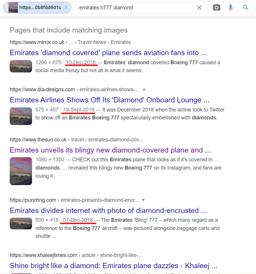 امارات ایئرلائنز سے منسوب کر شیئر کئے جا رہے جگمگاتے ہوئے جہاز کے کولاج کی سچائی جاننے کے لئے ہم نے اپنی ابتدائی تحقیقات کا آغاز کیا۔ ہم نے سب سے پہلے وائرل کولاج کو اویسم اسکرن شارٹ کی مدد سے کیفریم میں تقسیم کیا اور سبھی فریم کو گوگل ریوسر امیج سرچ کیا۔ جہاں ہمیں اس سے متعلق کئی خبروں کے لنک فراہم ہوئے جو پرانے تھے۔