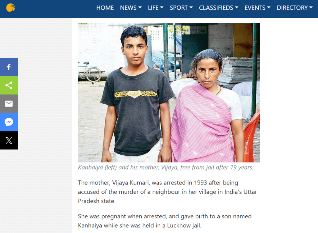 فوکٹ نیوز ویب سائٹ کے مطابق تصویر میں نظر آنے والی خاتون کا نام وجے کماری ہے جو اصل میں اتر پردیش کی رہنے والی ہیں۔ سال 1993 میں وجے کو اپنے پڑوسی کے قتل کے الزام میں گرفتار کیا گیا تھا۔ جب وجے کو گرفتار کیا گیا تو وہ حاملہ تھی۔ انہوں نے لکھنؤ جیل میں بیٹے کو جنم دیا، جس کا نام کنہیا رکھا۔ سال 1996 میں عدالت نے وجے کو ضمانت بھی دے دی تھی، لیکن اس کے شوہر کی جانب سے مچلکے نہ ادا نہ کر پانے کی وجہ سے وہ جیل میں ہی تھی۔ کنہیا پیدائش کے بعد چھ سال تک اپنی ماں کے پاس رہا، لیکن بعد میں اسے بال سدھار گرہ بھیج دیا گیا تھا۔