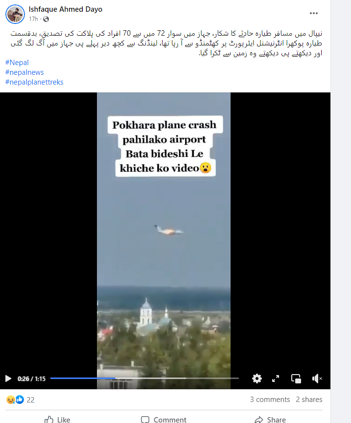 دوران پرواز طیارے میں لگی آگ کی ایک ویڈیو سوشل میڈیا پر گردش کر رہی ہے۔ دعویٰ ہے کہ یہ ویڈیو نیپال کے پوکھرا میں ہوئے یتی ایئرلائنس حادثے کی ہے۔ ترکیہ اردو نے ویڈیو کو شیئر کر لکھا ہے کہ “نیپال میں مسافر طیارہ حادثے کا شکار، جہاز میں سوار 72 میں سے 70 افراد کی ہلاکت کی تصدیق، بدقسمت طیارہ پوکھرا انٹرنیشنل ایئرپورٹ پر کھٹمنڈو سے آ رہا تھا، لینڈنگ سے کچھ دیر پہلے ہی جہاز میں آگ لگ گئی اور دیکھتے ہی دیکھتے وہ زمین سے ٹکرا گیا”۔