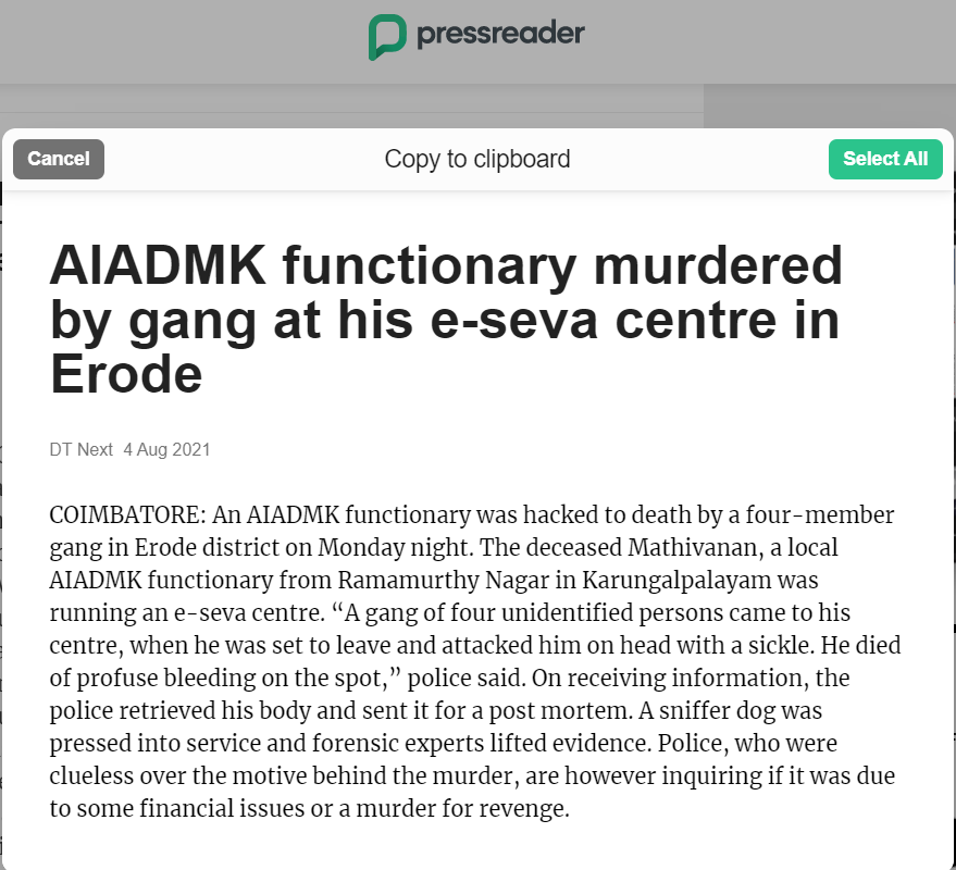 پھر ہم نے اس سے متعلق کچھ کیورڈ سرچ کیا۔ جہاں ہمیں ٹائمس آف انڈیا، اپڈیٹ نیوز360، پریس ریڈر، دی ہندو اور انسٹا نیوز پر 2، 3 اور 4 اگست 2021 کی خبریں ملیں۔ جس میں وائرل تصویر سے متعلق جانکاری دی گئی ہے کہ تامل ناڈو کے ایروڈ ضلع میں ایک شخص کو بے رحمی سے قتل کر دیا گیا۔ رامامورتی نگر میں مقتول شخص امّا پبلک ای سروس سینٹر چلا تا تھا۔ بتادوں کہ مقتول شخص کچھ دنوں پہلے ہی اے آئی اے ڈی ایم کے پارٹی میں شامل ہوا تھا۔