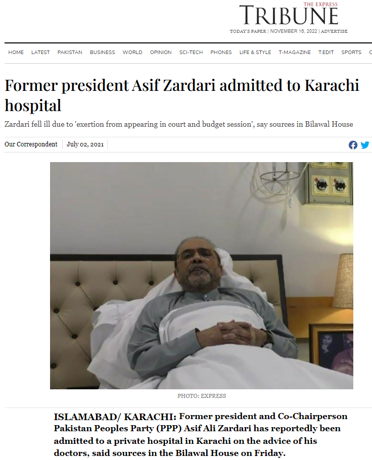 سرچ کے دوران ہمیں پاکستان کے معروف اخبار ٹربیون ڈاٹ کام کی 2 جولائی 2021 میں شائع ایک رپورٹ بھی ملی۔ اس رپورٹ میں بھی کہا گیا ہے کہ سابق صدر آصف ذرداری بجٹ سیشن اور عدالتی کاروائی میں مصروفیت کے دوران سفر کرنے کی وجہ سے ان کو تھکاوٹ محسوس ہورہی تھی، جس کے بعد ان کو اسپتال پنتقل کیا گیا۔