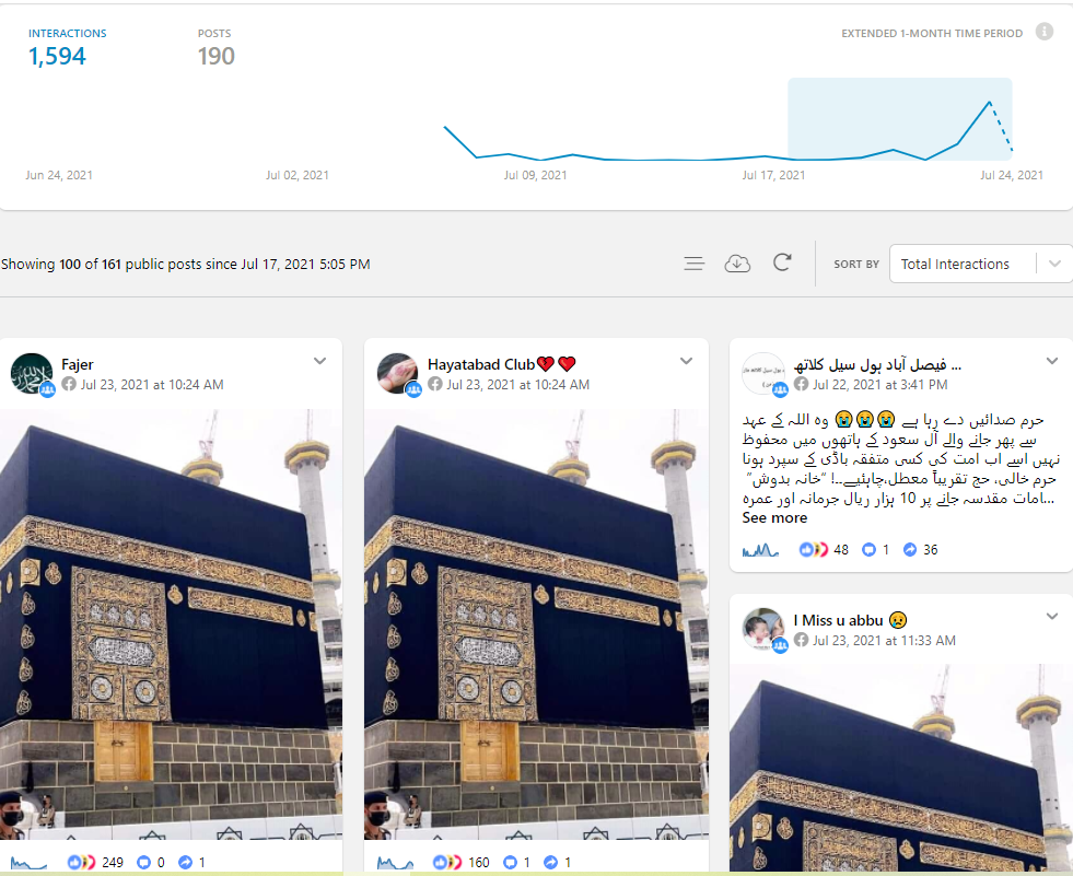 کراؤڈ ٹینگل پر جب ہم نے وائرل تصویر کے ساتھ کئے گئے دعوے سے متعلق کیورڈ سرچ کیا تو ہمیں پتا چلا کہ اس موضوع پر پچھلے 7 دنوں میں 1,594 فیس بک یوزرس تبادلہ خیال کر چکے ہیں۔