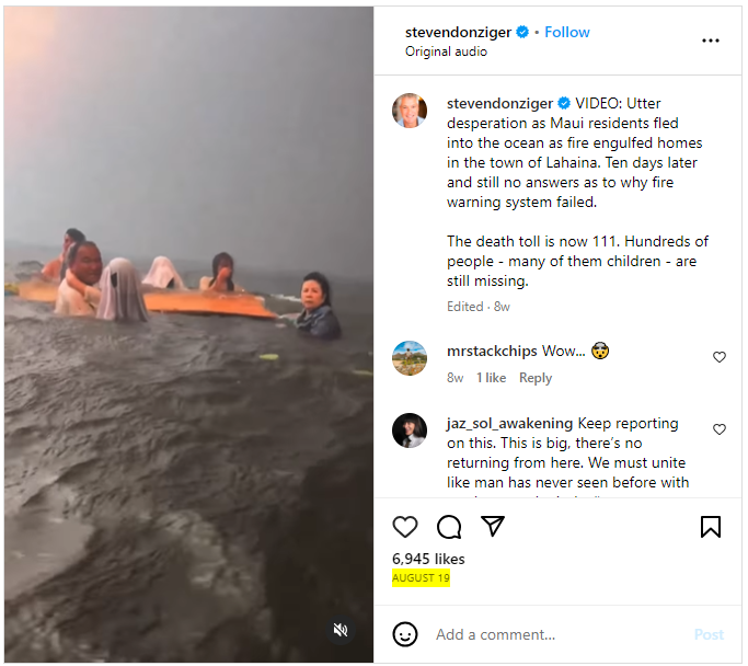 پانی میں تیرتے ہوئے مرد و خواتین والی ویڈیو کے ایک فریم کو ہم نے گوگل ین ڈیکس سرچ کیا۔ اس دوران ہمیں امریکی وکیل و مصنف اسٹیون ڈونزیگر نامی مستند انسٹاگرام ہینڈل پر 19 اگست 2023 کو شیئر شدہ ہوبہو ویڈیو ملی۔ جس میں اس ویڈیو کو لوہینا شہر میں لگی آگ کے بعد بے گھر ہوئے لوگوں کا بتایا گیا ہے۔
