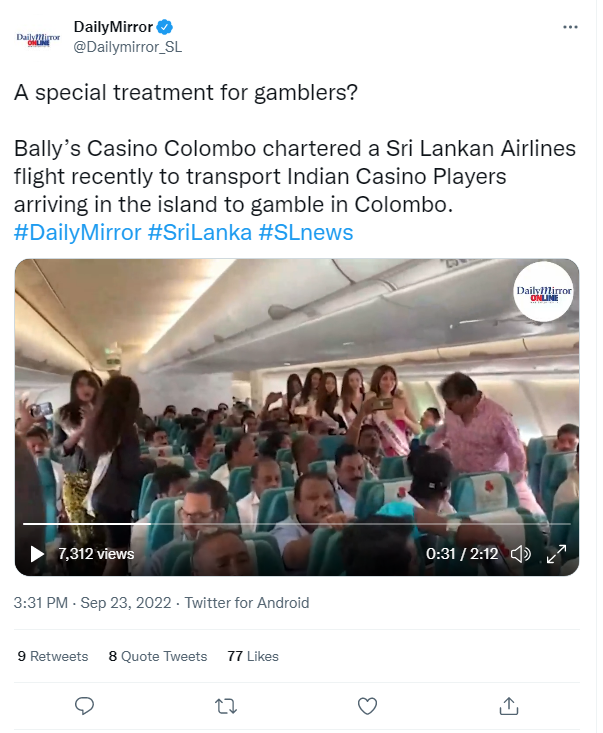 پھر ہم نے کیفریم کے ساتھ انگلش میں “سری لنکن فلائٹ، ریمپ واک، ماڈلنگ شو” کیورڈ سرچ کیا۔ اس دوران ہمیں سری لنکا سے شائع ہونے والی ڈیلی میرر کے آفیشل فیس بک اور ٹویٹر ہینڈل پر وائرل ویڈیو سے متعلق 23 ستمبر 2022 کے پوسٹ ملے۔ جس میں دی گئی معلومات کے مطابق بیلی کسینو کولمبو نے حال ہی میں سری لنکن ایئرلائنز کے ایک جہاز سے اپنے بھارتی کسینو کھلاڑیوں کو جزیرے پر بلوایا۔ اس پوری پرواز کے دوران ان کی تفریح کا بھی انتظام کیا گیا تھا۔ جس میں بین الاقوامی ماڈلز کا فیشن شو بھی شامل تھا۔