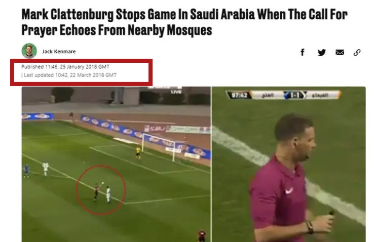 اس طرح نیوز چیکر کی تحقیقات میں یہ ثابت ہوا کہ جس ویڈیو کو قطر فٹبال اسٹیڈیم میں اذان کے لیے روکے گئے میچ کا بتا کر شیئر کیا جا رہا ہے، وہ دراصل 4 سال پرانی ہے جہاں سعودی عرب میں ہوئے کنگ سلمان اسپورٹ سٹی اسٹیڈیم کے قریبی مسجد میں ہوئی اذان سننے کے بعد ریفری مارک کلیٹن برگ نے کھیل روک دیا تھا۔