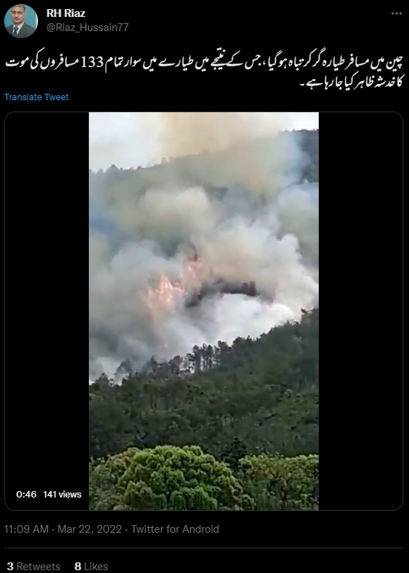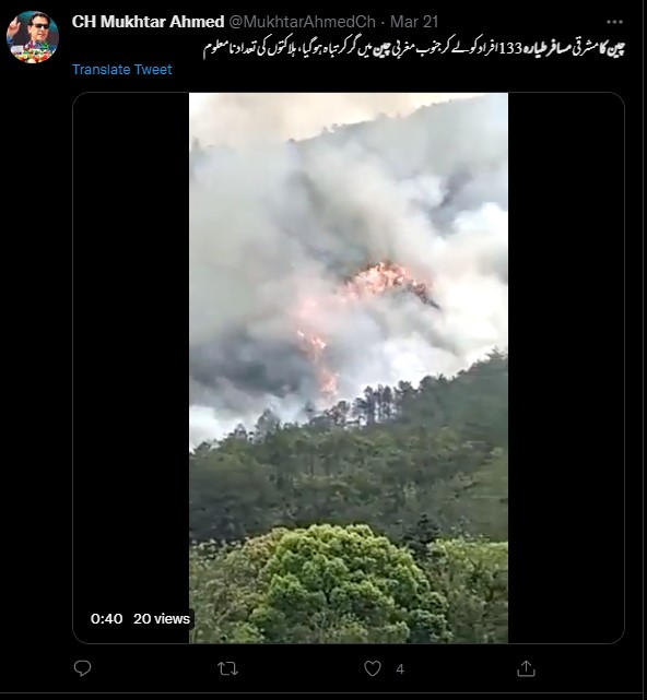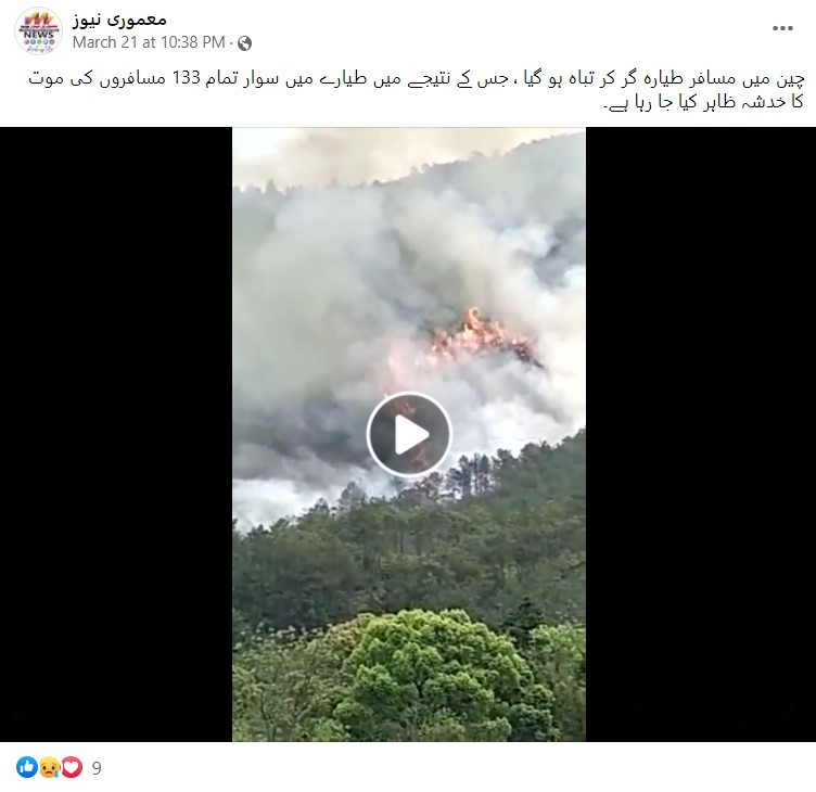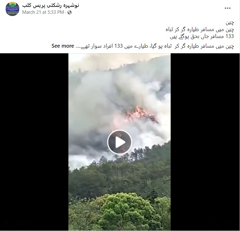 چین میں 21 مارچ کو ایک خوفناک طیارہ حادثہ پیش آیا، جس میں سوار تقریباً سبھی 132 لوگ جاں بحق ہو گئے تھے۔ اس ویڈیو کو جنوبی چین کے طیارے حادثے سے منسوب کر کے فیس بک و ٹویٹر پر متعدد صارفین نے شیئر کیا ہے۔ اسی سلسلے میں ایک ویڈیو شیئر کی جا رہی ہے، جس میں اونچے پہاڑوں کے بیچ سے دھواں نکلتا ہوا دکھ رہا ہے۔ اس ویڈیو کے ساتھ صارف نےکیپشن میں لکھا ہے کہ “چین کا مسافر طیارہ #بوئنگ_737 جنوب مغربی علاقے گوانگشی کے شہر ووژو کے قریب گر کر تباہ ہو گیا، جس کے ملبے میں آگ بھڑک اٹھی۔ طیارے میں 133 افراد سوار تھے”۔