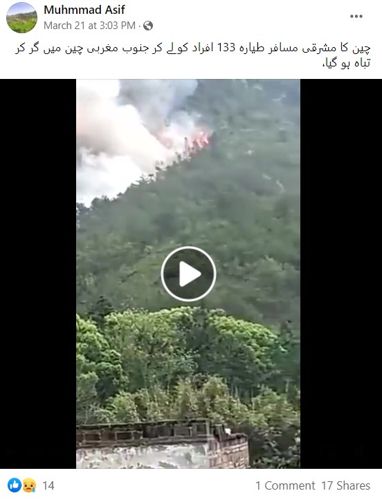 جنوبی چین کے طیارے حادثے سے جوڑ کر شیئر کی جا رہی ویڈیو کی حقیقت جاننے کے لئے ہم نے سب سے پہلے ویڈیو کو غور سے دیکھا۔ لیکن وہ ایک عام جنگل کی آگ کی ویڈیو لگ رہی تھی اور طیارے حادثے کے نام و نشان اس ویڈیو میں کہیں نظر نہیں آ رہے تھے۔ اس کے بعد ہم نے مزید ایسی ہی پوسٹ کو دیکھنا شروع کیا تو ایک انگلش زبان کے ایسے ہی دعوے کے ساتھ شیئر کی گئی پوسٹ کے کمنٹ سیکشن میں ایک کمنٹ نظر آیا۔ جس میں لکھا تھا کہ یہ ویڈیو چین کے فوجان کی ہے اور اس کا جنوبی چین کے طیارے حادثے سے کوئی تعلق نہیں ہے۔