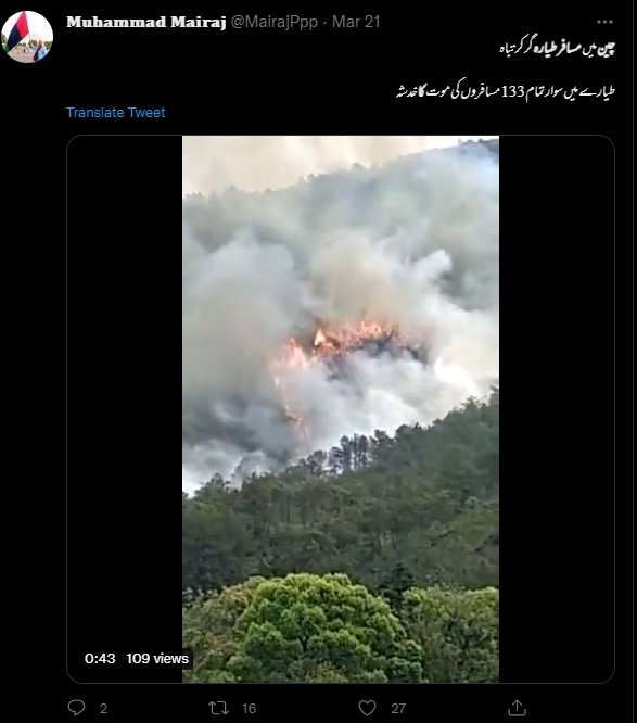 اس ویڈیو کو جنوبی چین کے طیارے حادثے سے منسوب کر کے فیس بک و ٹویٹر پر متعدد صارفین نے شیئر کیا ہے۔