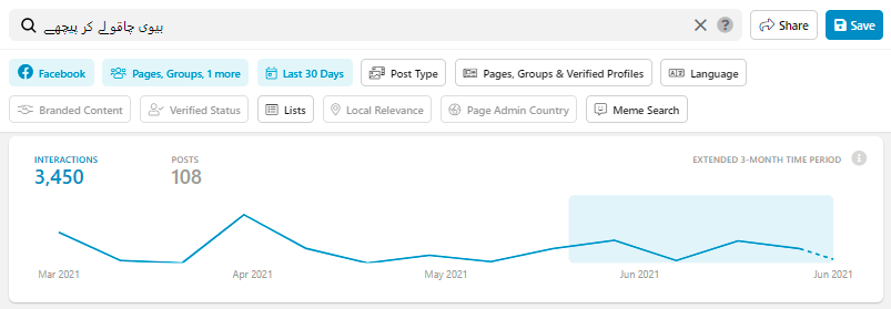 کراؤڈ ٹینگل پر جب ہم نے وائرل ویڈیو کے ساتھ کیے گئے دعوے سے متعلق کیورڈ سرچ کیا تو ہمیں پتا چلا کہ اس موضوع پر اس ماہ 3,450 فیس بک یوزرس تبادلہ خیال کر چکے ہیں۔جسے آپ درج ذیل میں دیکھ سکتے ہیں۔