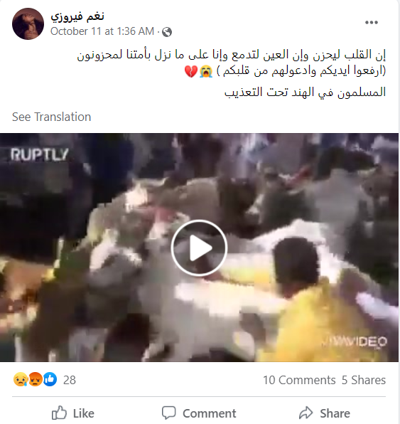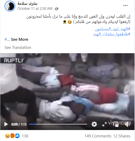 سوشل میڈیا پر ان دنوں مسلم ممالک کے صارفین بھارت کے کشمیری مسلموں کی حمایت میں #انقذوا مسلمي كشمير، #کشمیرـتباد،#الهند_تقتل_المسلمين، #كشمير_المحتلة وغیرہ ہیش ٹیگ کے ساتھ دوسرے واقعے کی تصاویر اور ویڈیو کو گمراہ کن دعوے کے ساتھ خوب شیئر کر رہے ہیں۔