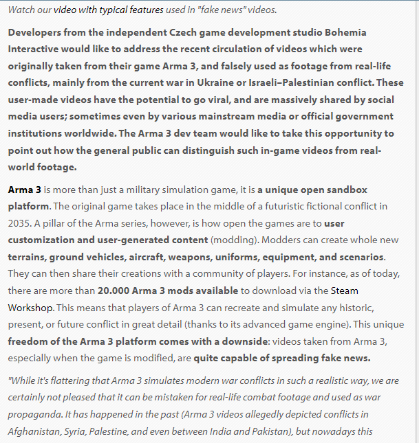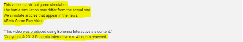 جس کے ڈسکرپشن میں واضح طور پر لکھا ہے کہ یہ ویڈیو ایک ورچوئل گیم سمولیشن ہے۔ ساتھ ہی ڈسکرپشن میں اسے آرما گیم پلے اور بوہیمیا انٹیریکٹیو اے ایس کنٹنٹ کی مدد سے تیار کرنے کا بھی ذکر کیا گیا ہے۔