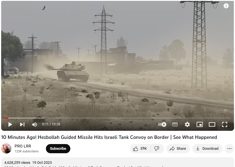 اسرائیلی ٹینک کو حماس کی جانب سے تباہ کرنے کا بتاکر شیئر کی گئی ویڈیو کے ایک فریم کو ہم نے سبھی گوگل ٹولس پر سرچ کیا۔ لیکن کچھی بھی اطمینان بخش نتائج نہیں ملے۔ پھر ہم نے یوٹیوب پر “آرما، گیم، وار، ٹینک اٹیک” کیورڈ سرچ کیا۔ جہاں ہمیں پی آر او ایل آر آر نامی یوٹیوب چینل پر 19 اکتوبر 2023 کو اپلوڈ شدہ ہوبہو ویڈیو ملی۔