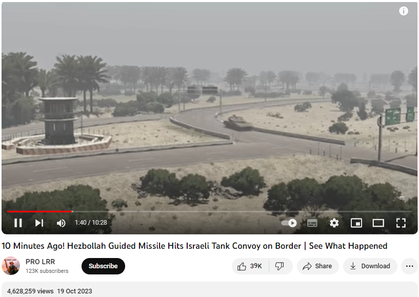 سوشل میڈیا پر اسرائیلی ٹینک کو حماس کی جانب سے تباہ کرنے کا بتاکر ایک ویڈیو شیئر کی جا رہی ہے۔ دعویٰ کیا جا رہا ہے کہ یہ وہی اسرائیلی ٹینک ہے جسے حماس نے تباہ کرنے کا اعلان کیا ہے۔ ایک فیس بک صارف نے ویڈیو کے ساتھ لکھا ہے کہ “یہودیوں تباہی کی یہ ویڈیو نہیں دیکھی تو کچھ نہیں دیکھا غیرت مند قوم نے مسلمان ہونے کا حق ادا کر دیا شکریہ”۔ ایک دوسرے صارف نے ویڈیو کے ساتھ لکھا ہے “حماس کے اسرائیلی ٹینکوں پر تابڑ توڑ حملے”۔