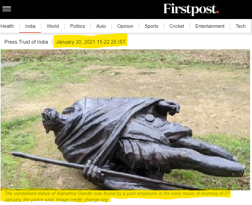 مہاتما گاندھی کے ٹوٹے ہوئے مجسمے والی تصویر کو گوگل ریورس امیج سرچ کرنے پر ہمیں اس حوالے سے متعد خبریں ملیں۔ جس میں مہاتما گاندھی کے ٹوٹے ہوئے مجسمے کی تصویر کو کیلیفورنیا کا بتایا گیا ہے۔ 2021 کے جنوری اور فروری ماہ میں شائع فسٹ پوسٹ اور دی وائر کی رپورٹس میں مہاتماگاندھی کی وہی تصویر ملی جو سوشل میڈیا پر وائرل ہے۔ تصویر کے کیپشن میں دی گئی معلومات کے مطابق مہاتما گاندھی کے مجسمے کی یہ تصویر کیلیفورینا کے ڈیوس کے ایک پارک کی ہے۔ جہاں 27 جنوری کی صبح اسے ٹوٹی ہوئی حالت میں پایا گیا تھا۔ بتادوں کہ اس تصویر کا کریڈٹ چینج ڈاٹ او آر جی کو دیا گیا ہے۔
