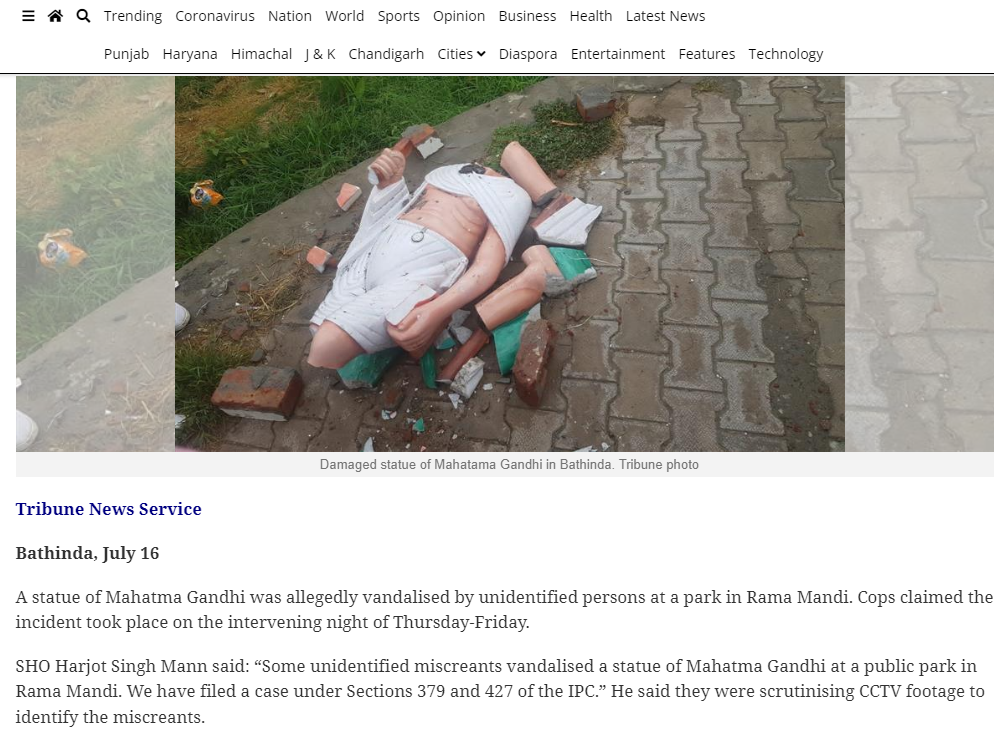 تصویر کے ساتھ کئے گئے دعوے کی سچائی جاننے کے لئے ہم نے “بھٹنڈا میں گاندھی کے مجسمے کی توڑ پھوڑ” کیورڈ سرچ کیا. اس دوران ہمیں انڈیا ٹوڈے ، اے بی پی نیوز اور ٹریبیون انڈیا کی ویب سائٹس پر بھٹنڈا میں توڑے گئے گاندھی کے مجسمے کے حوالے سے 16 جولائی 2022 کی رپورٹس ملیں۔ ان رپورٹس کے مطابق بھٹنڈا کے رمن منڈی کے ایک پارک میں موجود مہاتما گاندھی کے مجسمے کو نامعلوم لوگوں نے توڑ دیا۔ ٹریبیون انڈیا نے ایس ایچ او ہرجوت سنگھ مان کے حوالے سے لکھا ہے کہ ، کچھ مشتبہ لوگوں نے رمن منڈی کے پبلک پارک میں موجود مہاتما گاندھی کے بت کو نقصان پہنچایا۔ جن کے خلاف آئی پی سی 379 اور 427 کے تحت مقدمہ درج کرلیا گیا ہے اور سی سی ٹی وی فوٹیج کے ذریعے مجرمین کو پہنچاننے کی کوشش کی جا رہی ہے۔