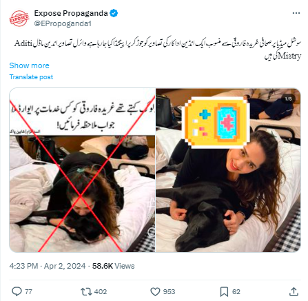 غریدہ فاروقی کا بتا کر شیئر کی گئی تصویر کی حقیقت جاننے کے لئے سب سے پہلے ہم نے اس کو گوگل ریورس امیج سرچ کیا۔ اس دوران ہمیں ایکسپوز پروپیگنڈا نامی مستند ایکس ہینڈل پر 2 اپریل 2024 کی ایک پوسٹ ملی۔ جس میں بتایا گیا ہے کہ یہ تصویر غریدہ فاروقی کی نہیں بلکہ بھارتی ماڈل ادیتی مستری کی ہے۔