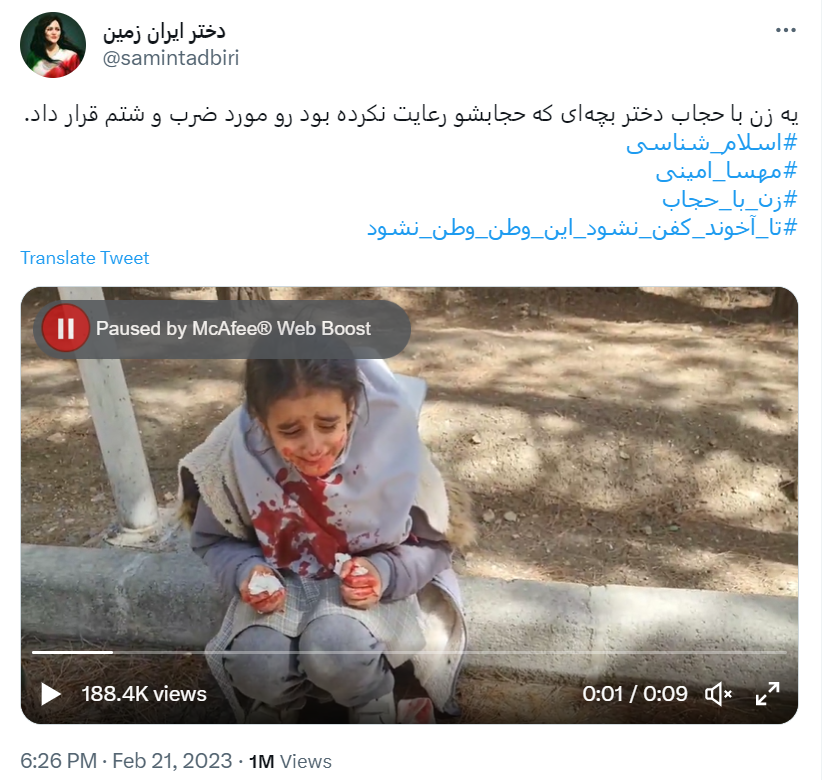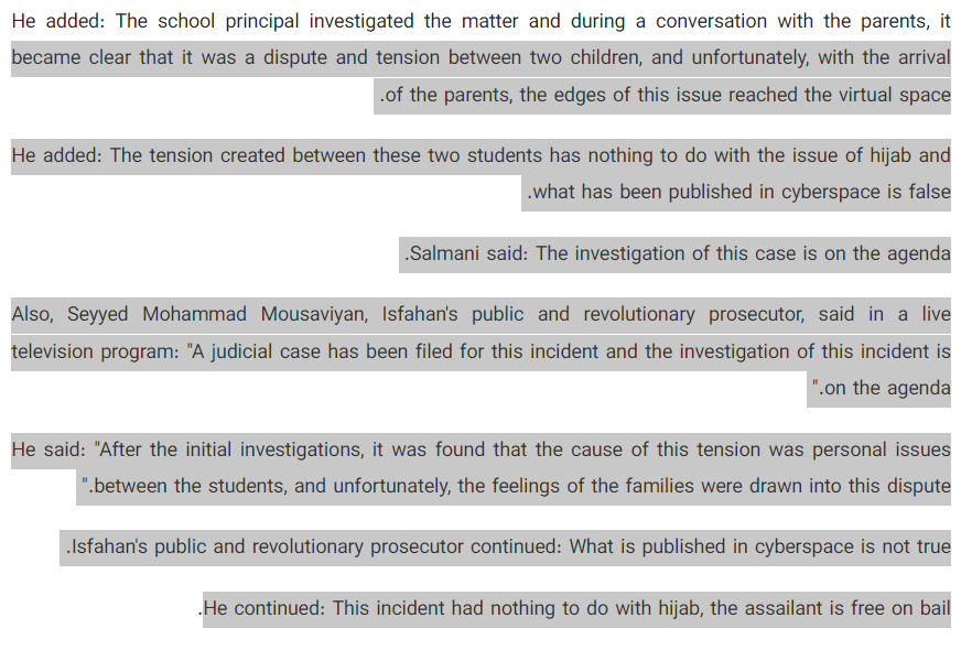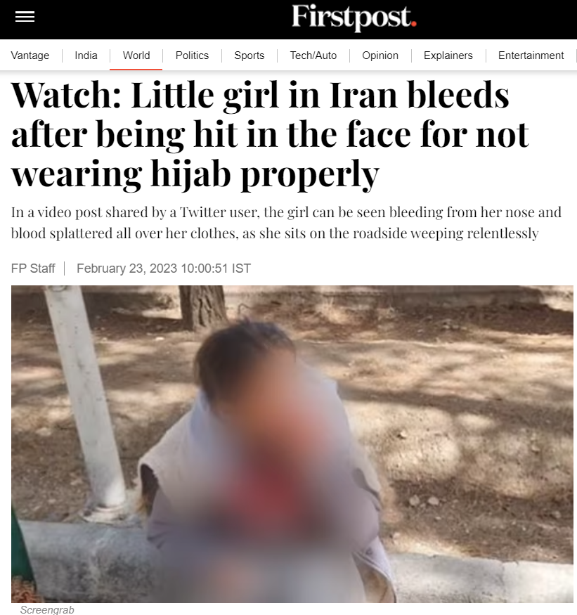 مھر نیوز ایجنسی کی وئب سائٹ پر شائع ایک رپورٹ کے ساتھ بچی کی ویڈیو کا اسکرین گریب شائع کیا گیا ہے۔ رپورٹ میں بتایا گیا ہے کہ ایران کے اصفاہان میں ایک اسکول میں دو بچوں کی آپس میں لڑائی ہوئی جس کے بعد ایک بچے کی والدہ نے اس بچی کو مارا جس کی وجہ سے یہ خون آلود ہوگئی۔