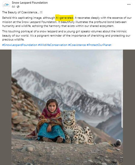 ہم نے برفانی چیتے کے ساتھ نظر آرہی بچی کی تصویر کو گوگل ریورس امیج سرچ کیا۔ جہاں ہمیں پاکستان تنظیم اسنو لیوپارڈ فاؤڈیشن نامی فیس بک پیج پر یہی تصویر ملی۔ جس میں اس وائرل تصویر کو اے آئی کی مدد سے تیار کردہ بتایا گیا ہے۔